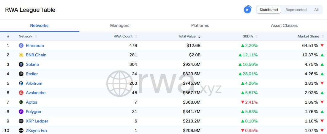Ethereum nắm giữ 12,6 tỷ USD, tương đương 64,51% thị phần RWA phân phối. BNB Chain đạt 2,02 tỷ USD (10,37%), Solana 924,59 triệu USD (4,75%), Stellar 829,48 triệu USD (4,26%) và Arbitrum 745,92 triệu USD (3,83%).