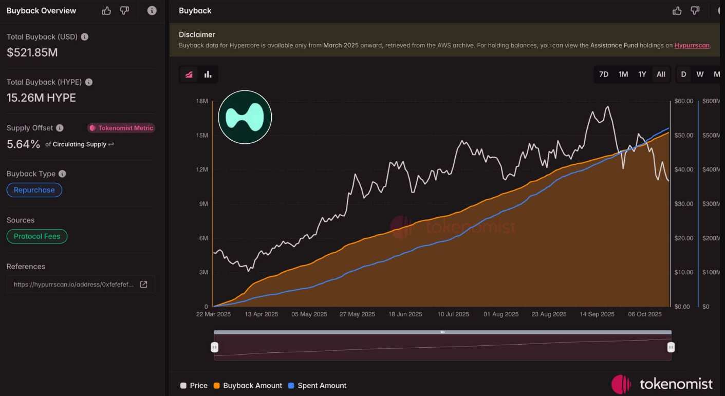 Theo dữ liệu từ Tokenomist, cơ chế mua lại của Hyperliquid đã tích lũy lượng HYPE trị giá hơn 522 triệu USD kể từ khi ra mắt — tương đương hơn 5,6% tổng nguồn cung lưu hành.