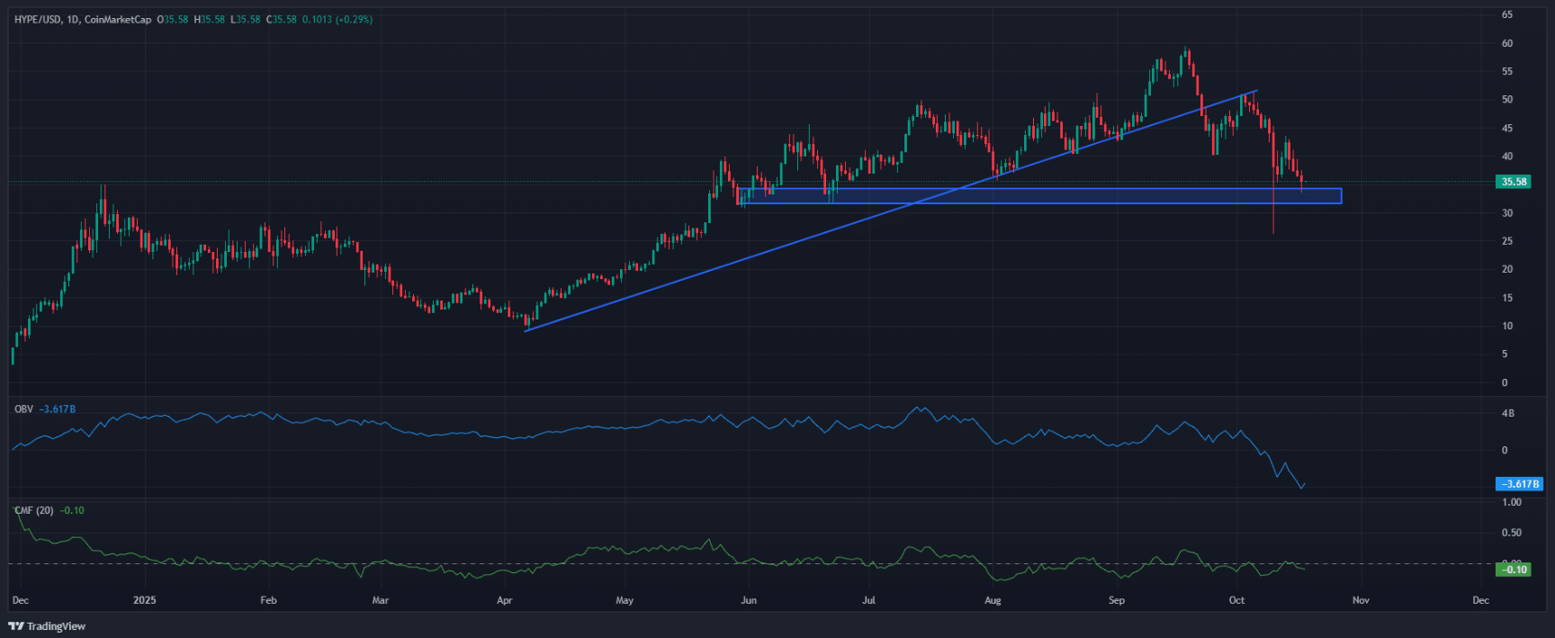 Biểu đồ kỹ thuật cho thấy HYPE đã đánh mất đường hỗ trợ và đang hình thành mô hình đỉnh thấp – đáy thấp, phản ánh rõ cấu trúc giá mang thiên hướng giảm.