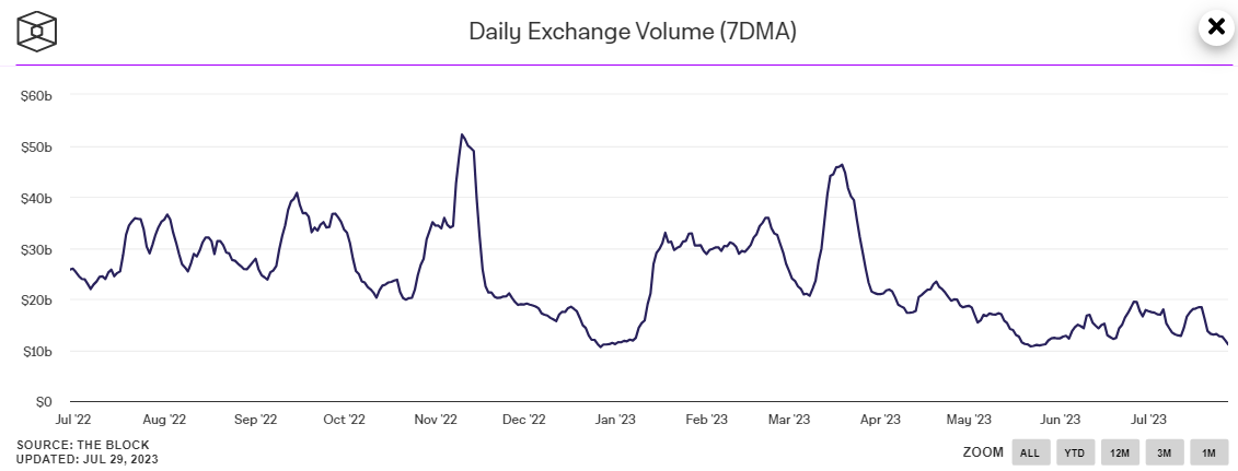 Khối lượng giao dịch giao ngay gần với mức thấp nhất trong năm, với đường trung bình động bảy ngày cho giao dịch tiền điện tử giao ngay hiện ở mức 11,1 tỷ đô la, chỉ bằng 1/4 so với thời điểm nó đạt mức cao nhất trong năm trên 40 tỷ đô la vào tháng Ba.