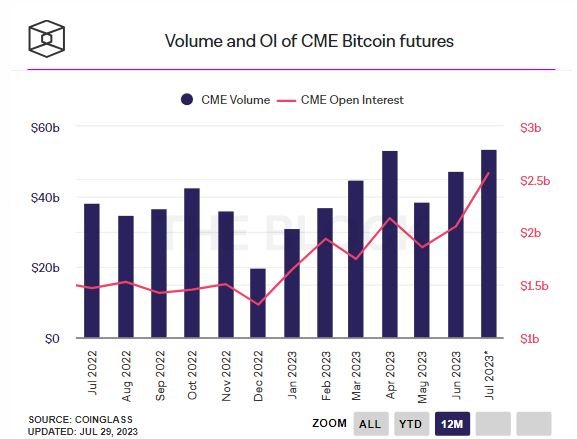 Mặc dù khối lượng đang giảm dần trên khắp các điểm và sàn giao dịch tiền điện tử, CME Group đã ghi nhận khối lượng hàng tháng cao nhất trong năm vào tháng 7.
