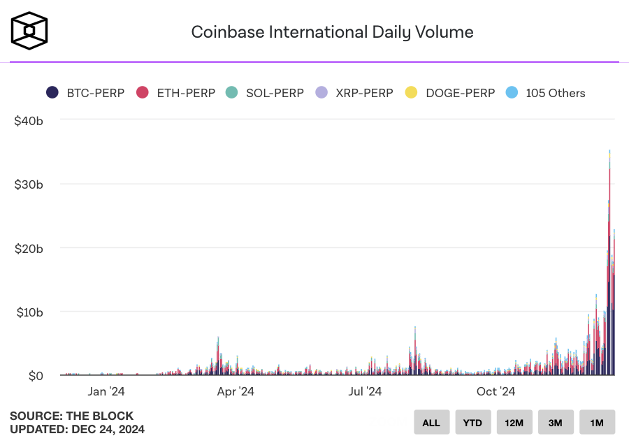 Để so sánh, trong tháng 11 vừa qua, khối lượng giao dịch trung bình hàng ngày của Coinbase International chỉ đạt khoảng 2,5 tỷ USD. Tuy nhiên, bước sang tháng 12, sàn giao dịch này đã tăng trưởng mạnh mẽ, với khối lượng giao dịch trung bình gần 10 tỷ USD mỗi ngày.