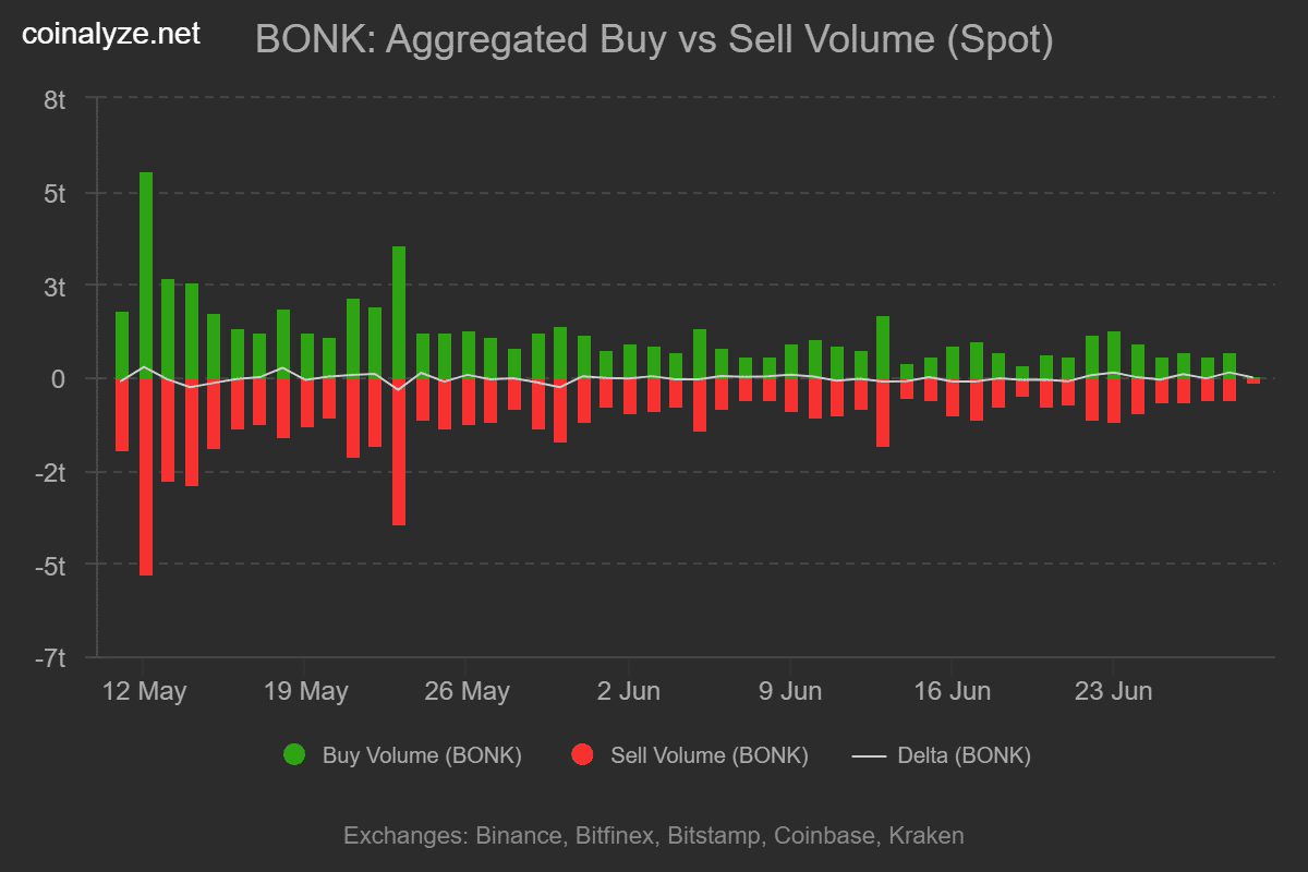 Theo dữ liệu từ Coinalyze, vào ngày 29/6, BONK ghi nhận 309 tỷ khối lượng mua so với 182 tỷ khối lượng bán – một dấu hiệu lực mua đang áp đảo trên thị trường.