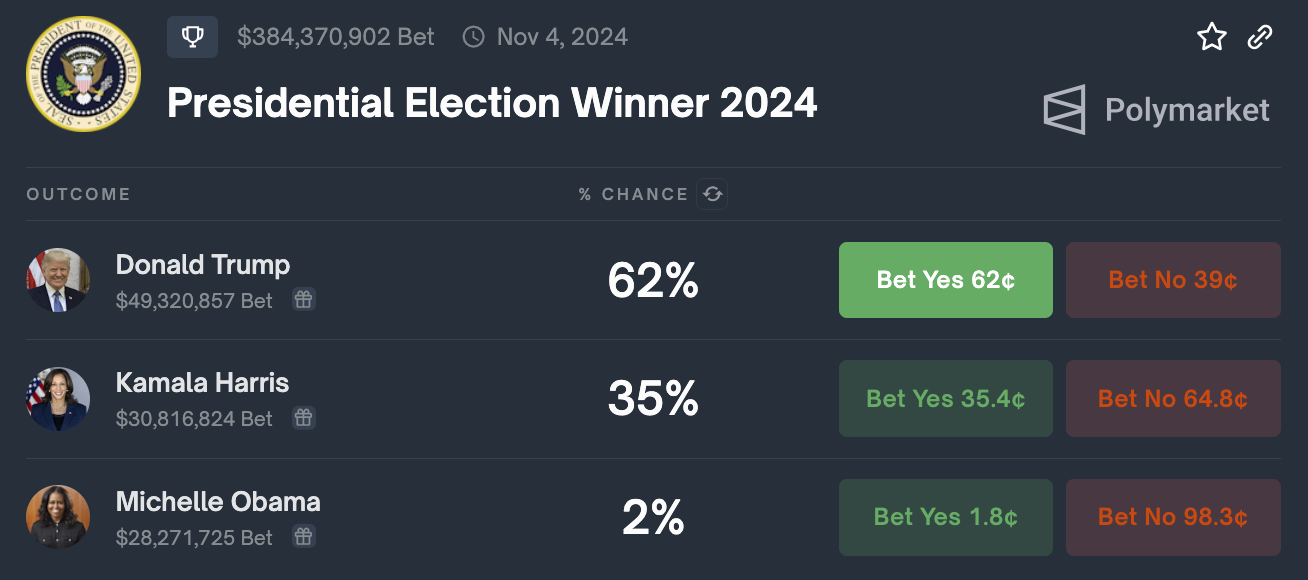 Các thị trường chính trị phổ biến trên Polymarket có các ván cược về việc ai sẽ là tổng thống Hoa Kỳ tiếp theo và ai sẽ giành được đề cử tổng thống của đảng Dân chủ – các thị trường đã chứng kiến hàng trăm triệu đô la tiền cược.
