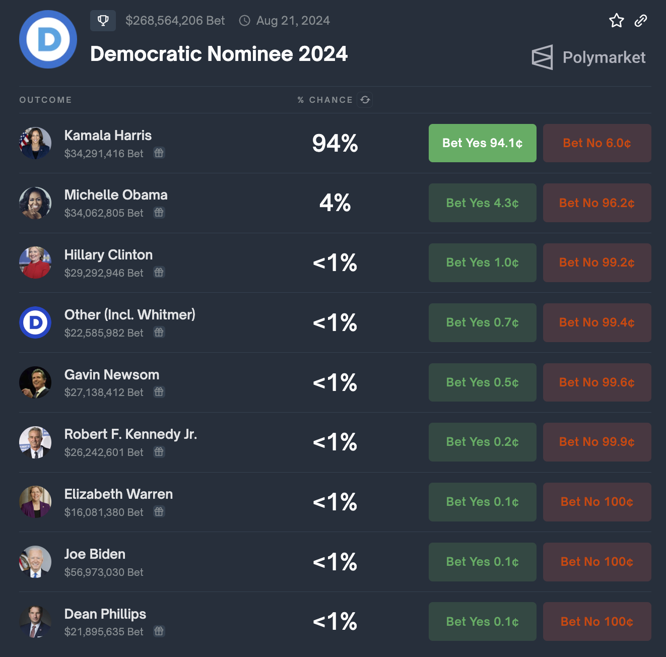 Sau khi Tổng thống đương nhiệm Joe Biden rút lui khỏi cuộc đua, nền tảng này chỉ ra rằng Phó Tổng thống Hoa Kỳ Kamala Harris có 94% cơ hội giành được đề cử của đảng Dân chủ.