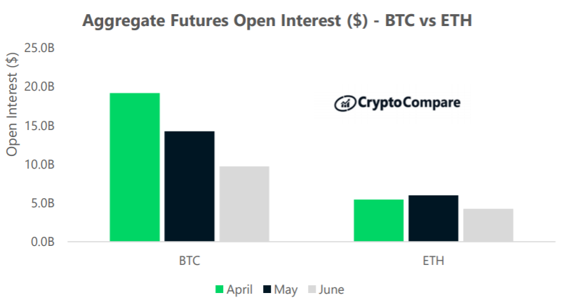 Khối lượng giao dịch, theo sát đà giảm của bitcoin, đã sụt giảm trên cả thị trường giao ngay và thị trường phái sinh so với tháng Năm.