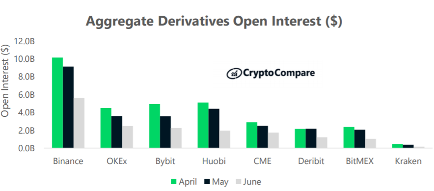 Khối lượng phái sinh tiền điện tử, chẳng hạn như hợp đồng tương lai và quyền chọn, đã vượt qua thị trường giao ngay vào tháng 6, theo một báo cáo hàng tháng của CryptoCompare.