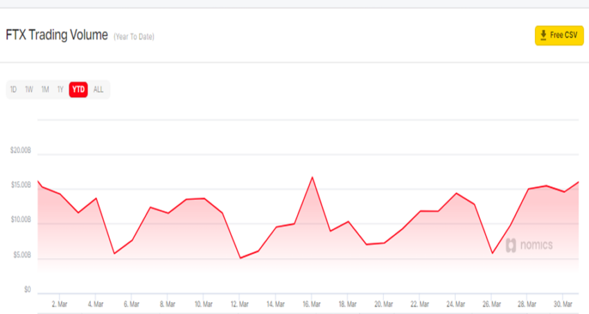 FTX có khối lượng giao dịch tăng 64% so với cùng kỳ năm trước kể từ tháng 3/2021. Khối lượng giao dịch cho tháng 3/2021 là khoảng 220 tỷ đô la, theo dữ liệu từ Nomics.