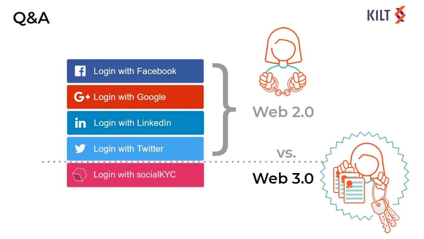 Trong khi đó, cách tiếp cận SocialKYC đối với dữ liệu cá nhân nhạy cảm hoàn toàn khác với cách tiếp cận của các hệ thống Web 2.0. Nó sẽ quên thông tin đăng nhập của người dùng khi được hệ thống cấp quyền. Với SocialKYC, KILT đang thực hiện một cách tiếp cận mới bằng cách cho phép người dùng xác minh danh tính bằng cách chứng minh họ đang kiểm soát các tài khoản mạng xã hội và địa chỉ email của họ.