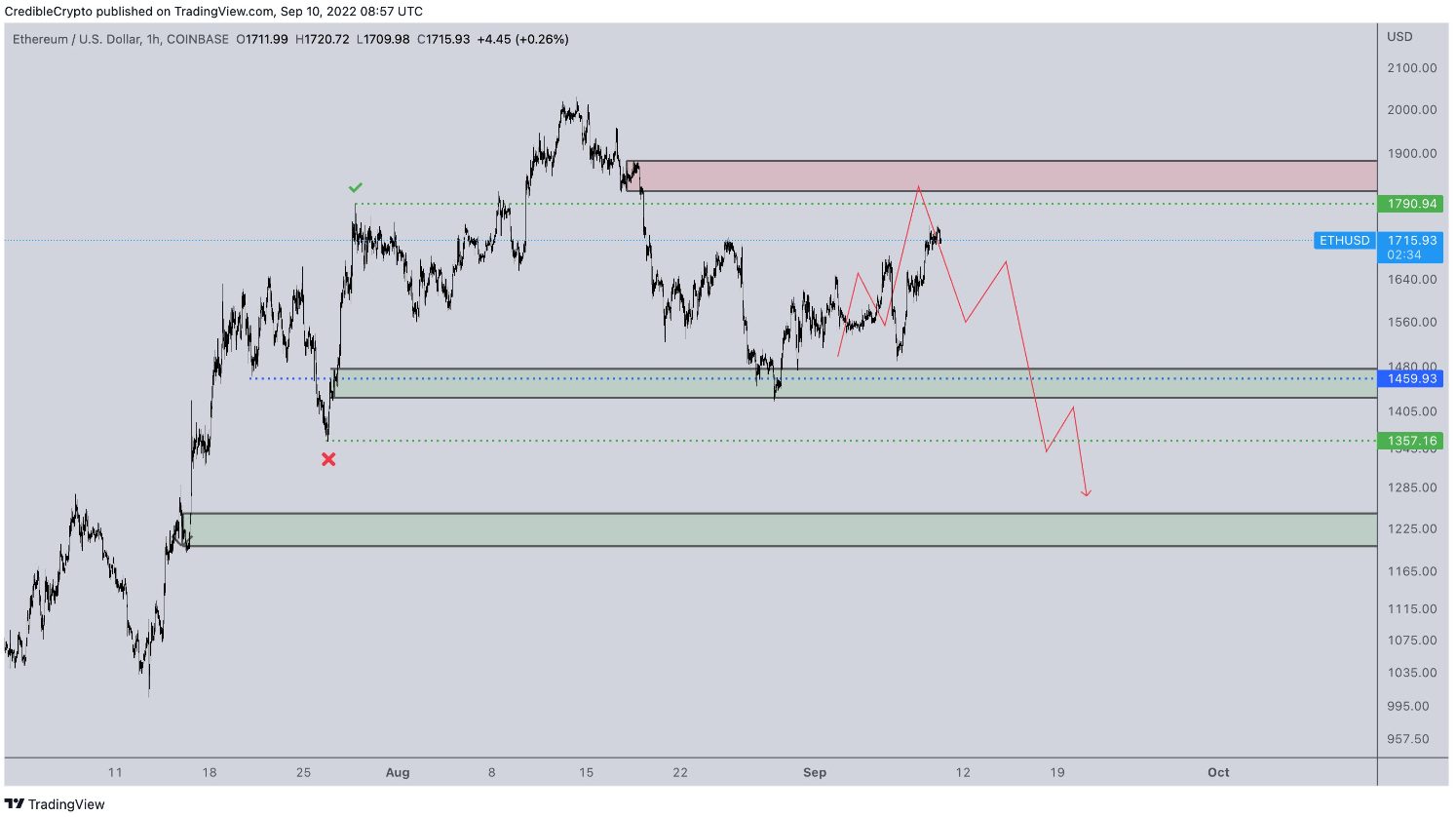 Nhìn vào biểu đồ của Credible, anh ấy dự đoán Ethereum sẽ giảm xuống $ 1.200, tức là mức giảm giá 36% nếu ETH đạt đến mục tiêu $ 1.900.