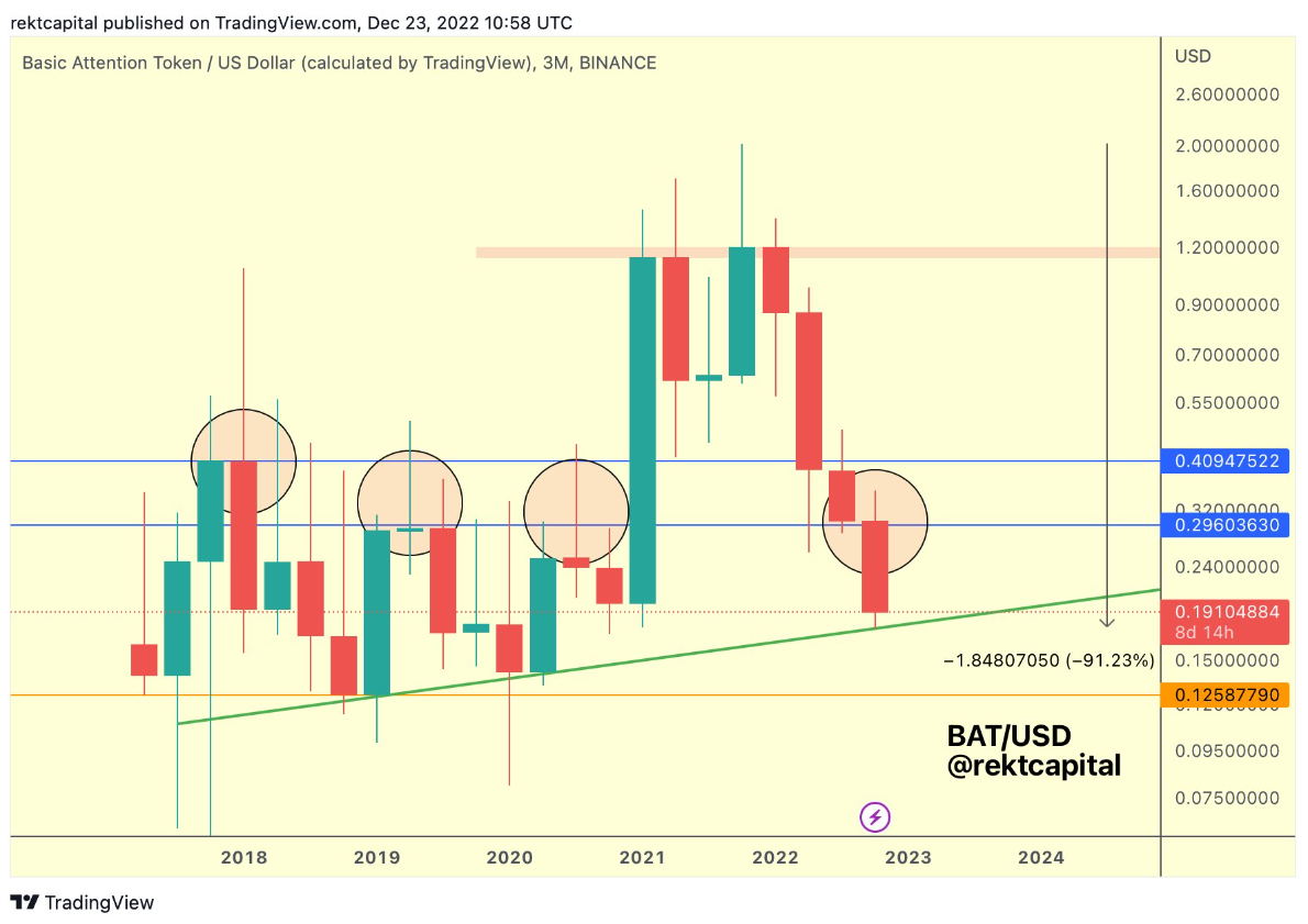 Cuối cùng, Rekt Capital phân tích Basic Attention Token (BAT), dự đoán rằng token này có thể giảm thêm vào đầu năm tới.