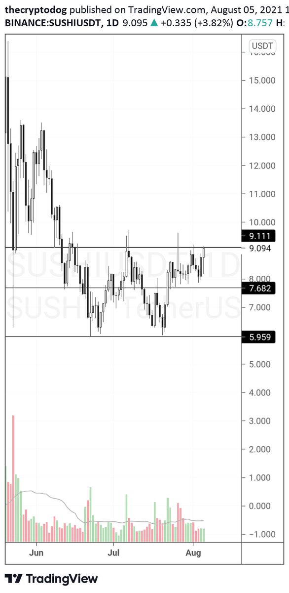 Nhà phân tích cũng đang để mắt đến công cụ tạo lập thị trường tự động SushiSwap (SUSHI), theo anh hiện đang chuẩn bị bùng nổ sau khi loại bỏ một vùng kháng cự quan trọng.