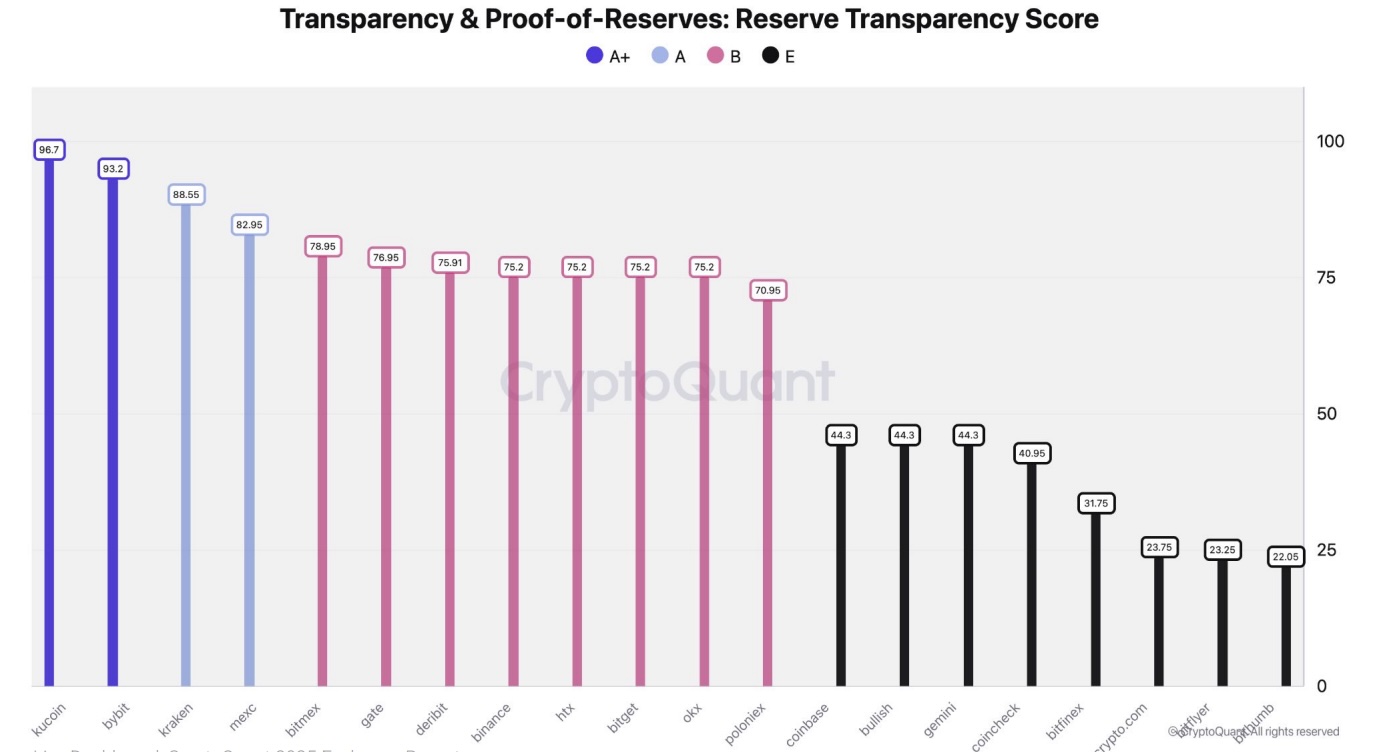 Báo cáo đã đánh giá hiệu suất của các sàn giao dịch trong năm 2025 dựa trên nhiều tiêu chí, bao gồm khối lượng giao dịch, mức độ công khai dự trữ và hoạt động phái sinh. Trong đó, KuCoin đạt điểm minh bạch PoR 96,7/100 — cao nhất trong toàn bộ dữ liệu khảo sát.