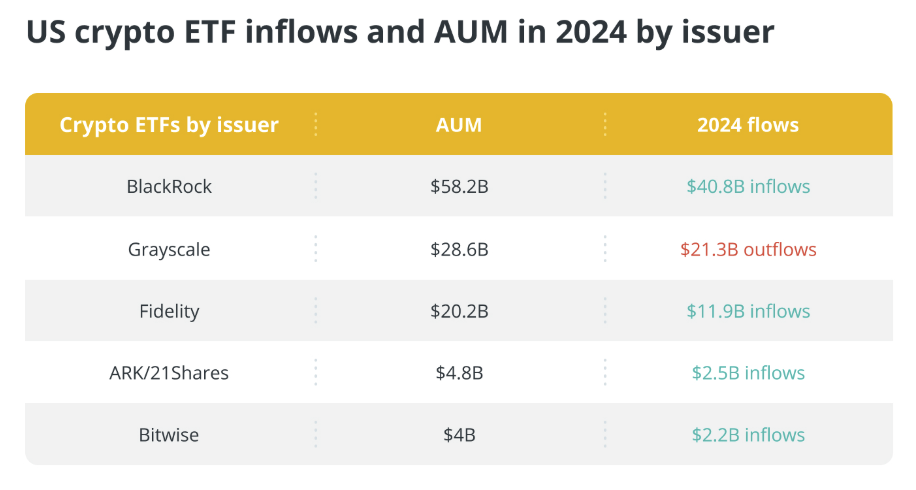 Chỉ trong chưa đầy một năm, các quỹ này đã đóng góp 100% trong tổng số 44,2 tỷ USD dòng vốn đầu tư vào các sản phẩm đầu tư tiền điện tử trên toàn cầu tính đến cuối năm 2024.