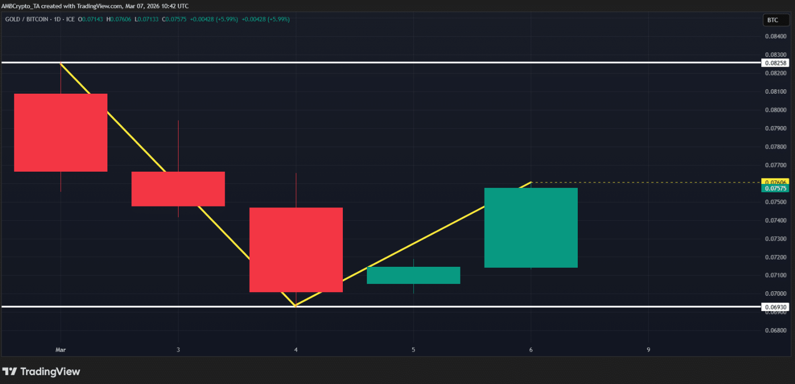 Tuy vậy, khi đà tăng suy yếu, thị trường bắt đầu đặt câu hỏi: liệu Bitcoin có thực sự duy trì được vai trò đó? Cùng lúc, tỷ lệ XAU/BTC đã bật tăng 6% chỉ trong một ngày, qua đó phục hồi gần 50% mức giảm của cả tuần — một tín hiệu cho thấy dòng tiền có thể đang dịch chuyển trở lại các tài sản truyền thống như vàng.