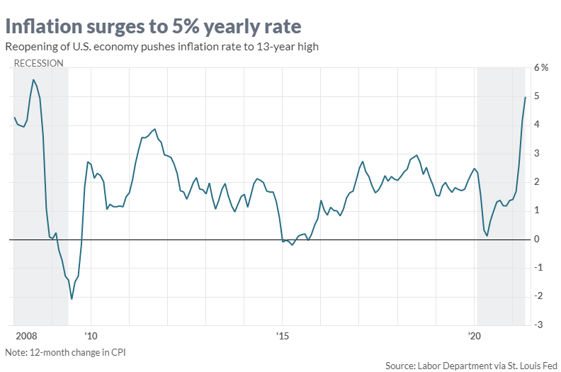 Chỉ số giá tiêu dùng (CPI), thước đo giá hàng hóa và dịch vụ tiêu dùng, đã tăng 5% hàng năm vào tháng 5, đạt mức cao nhất kể từ tháng 8 năm 2008, theo Cục Thống kê, Bộ Lao động Mỹ.