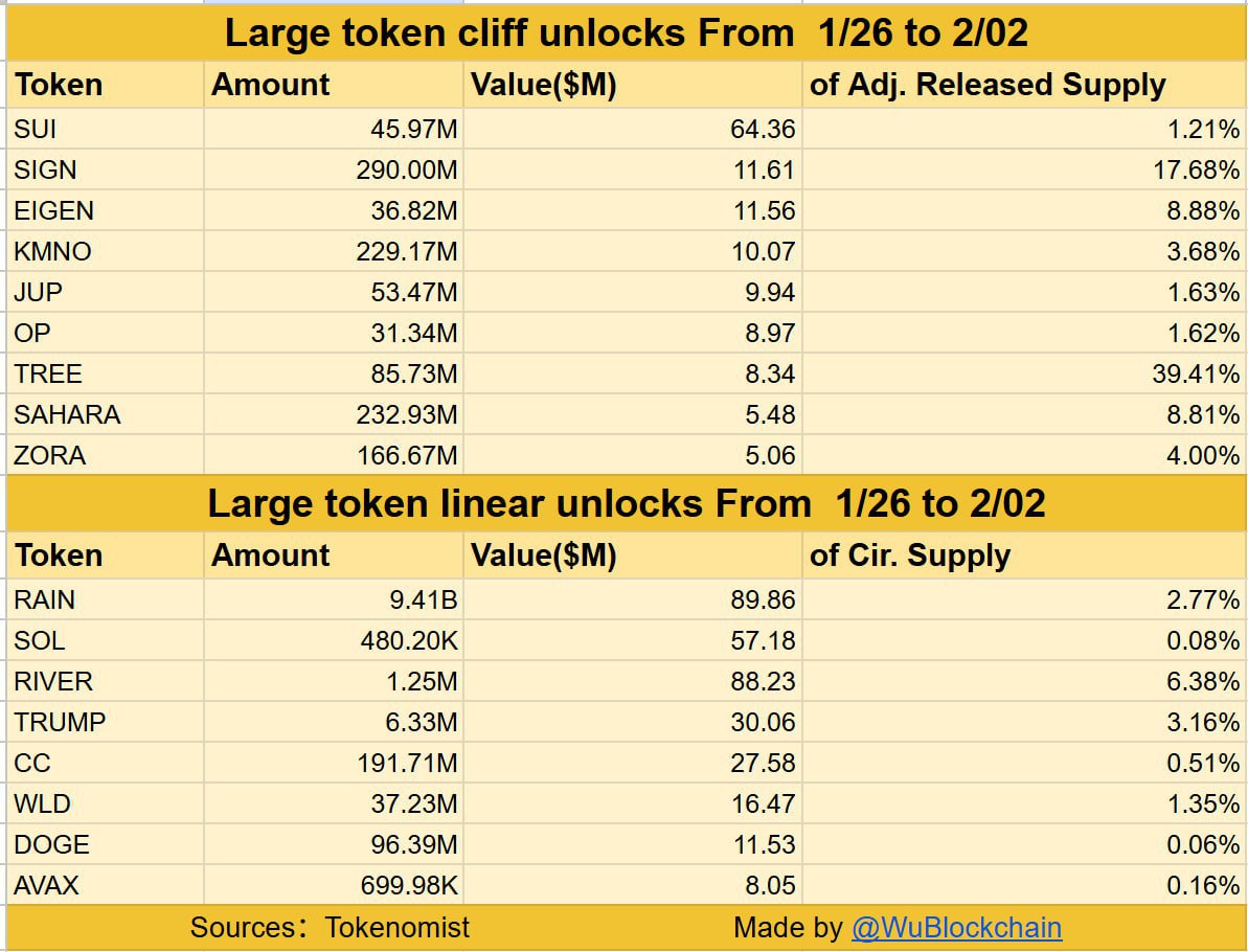 Theo dữ liệu từ Tokenomist, thị trường tiền mã hóa sẽ đối mặt với làn sóng mở khóa token quy mô lớn trong 7 ngày tới, với tổng giá trị vượt 464 triệu USD. Đáng chú ý, các đợt mở khóa một lần có giá trị trên 5 triệu USD sẽ diễn ra ở nhiều dự án như SUI, SIGN, EIGEN, KMNO, JUP, OP, TREE, SAHARA, ZORA… Những đợt unlock này có thể làm gia tăng áp lực bán trong ngắn hạn, đặc biệt với các token có thanh khoản hạn chế.