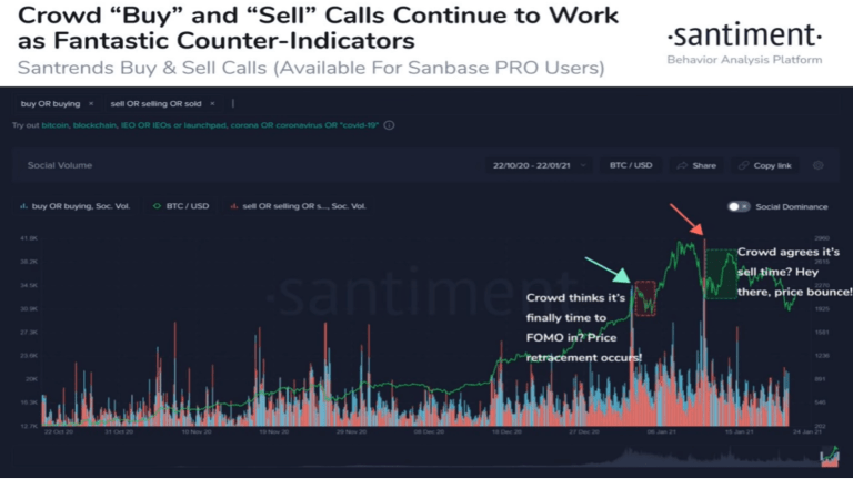 “Hầu hết các nhà đầu tư, họ sẽ mua đỉnh, bán đáy, mua đỉnh, bán đáy, rửa sạch và lặp lại cho đến khi bị phá sản. Dưới đây là biểu đồ từ Santiment cho thấy rằng khi phần lớn tâm lý trên mạng xã hội nói rằng “mua mua mua mua mua mua” thì đó thực sự là thời điểm để bán, bán, bán. Và rằng khi phần lớn các phương tiện truyền thông xã hội nói rằng, “Này đã đến lúc bán, mọi thứ sẽ về mo!” Thì đó thực sự là lúc để mua. Và tôi biết điều đó nghe có vẻ điên rồ, nhưng đây là điều mà bầy đàn này làm mỗi khi quái đản.”