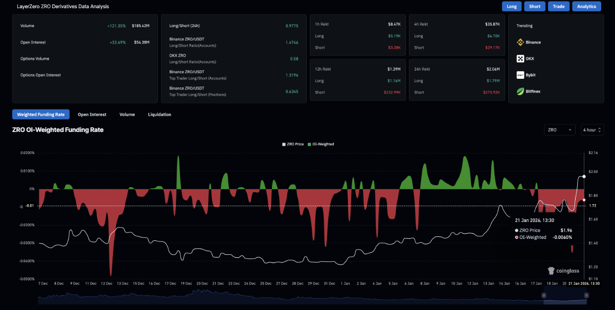 Ở mảng phái sinh, diễn biến cũng mang sắc thái tích cực. Hợp đồng mở của hợp đồng tương lai ZRO đã tăng vọt 32% chỉ trong vòng 24 giờ, lên mức 54,38 triệu USD, phản ánh sự gia tăng rõ rệt của các vị thế đang mở. Đồng thời, funding rate cải thiện lên -0,0060% từ mức -0,0353% trước đó, cho thấy tâm lý bán khống từ các vị thế mới đang dần hạ nhiệt.