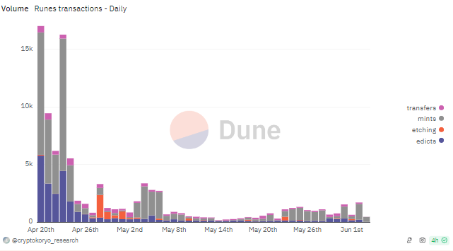 Trong những ngày sau khi ra mắt vào ngày 19/04, sự quan tâm đến Runes tăng vọt. Theo dữ liệu on-chain từ Dune, chỉ trong ba ngày sau, giao thức đã chứng kiến hơn 1 triệu giao dịch. Thế nhưng, khối lượng giao dịch đã giảm mạnh tới 90% trong những tuần tiếp theo, trong bối cảnh hệ sinh thái tiền điện tử hạ nhiệt.