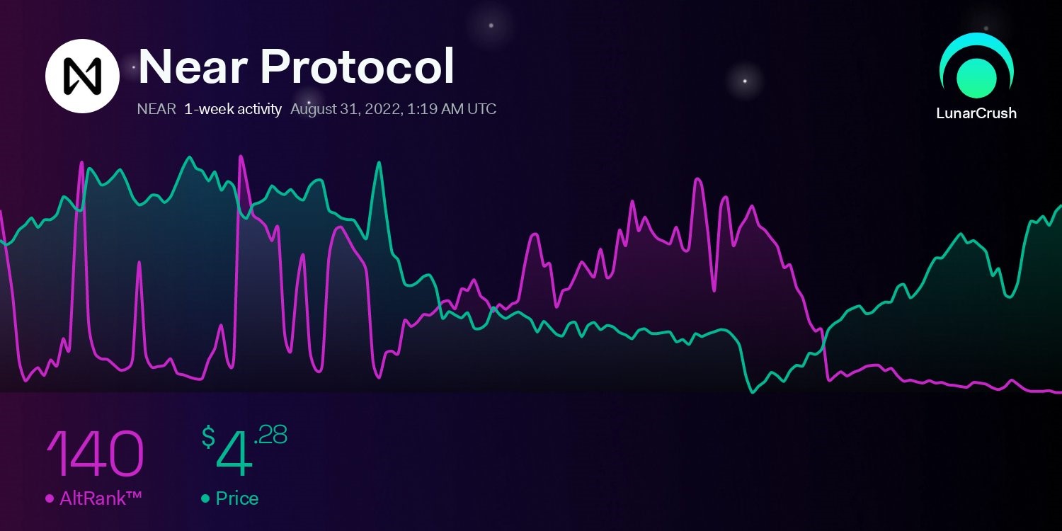 Theo sau là token NEAR với 11,1%. Token AURORA đứng ở vị trí thứ 3 với mức tăng 10,3%. Điều quan trọng cần lưu ý là NEAR đã có một tuần đầy hứa hẹn. Trước đó, theo LunarCrush, xếp hạng altcoin (AltRank) của NEAR đã giảm trong tuần trước.