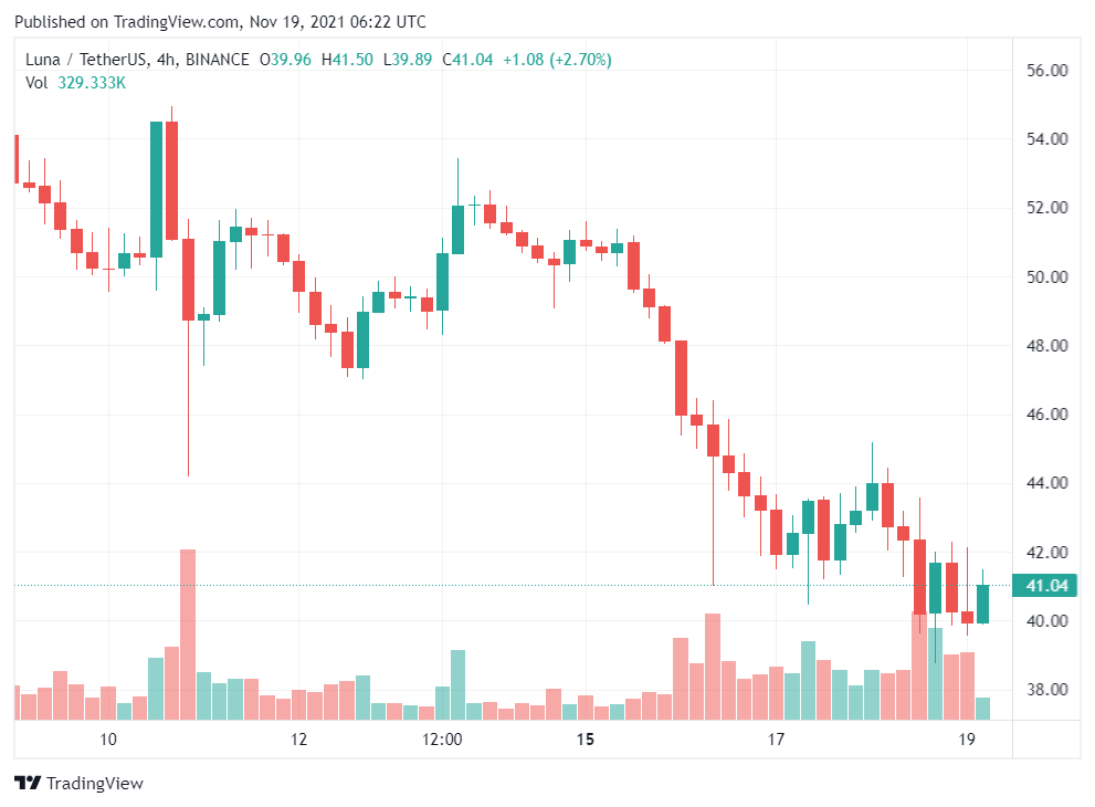 LUNA là tâm điểm vào đầu tháng 11 sau khi giá vượt qua mốc 50 đô la và đạt ATH mới. Tuy nhiên, cũng giống như các altcoin khác, ngay cả LUNA cũng không thể tự bảo vệ mình khỏi tâm lý giảm giá rộng lớn hơn. Kể từ ngày 14/11, tiền điện tử này giảm hơn 20% giá trị. Vào thời điểm viết bài, nó đang giao dịch trong khung 40 đô la.