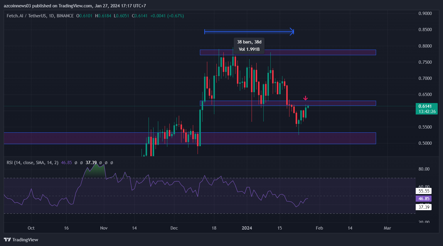 Biểu đồ hàng ngày cho thấy giá FET đã phá vỡ xuống dưới phạm vi ngắn hạn từ $0,62 đến $0,78, được hình thành trong 38 ngày. Sau khi bật lên từ vùng hỗ trợ dài hạn ở $0,53, nó đang trong quá trình kiểm tra lại ngưỡng hỗ trợ của phạm vi (mũi tên màu đỏ).