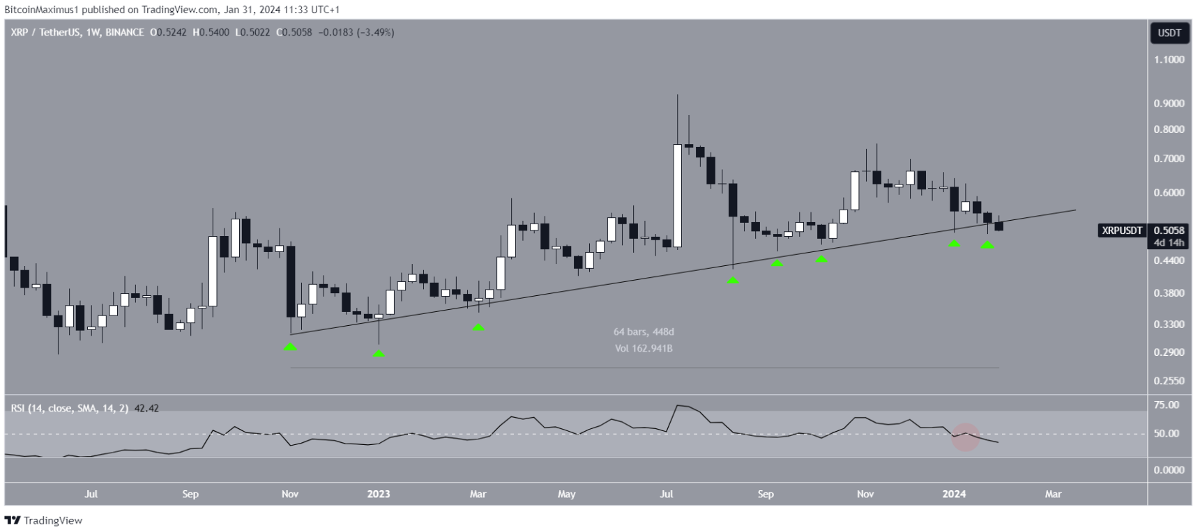 Phân tích kỹ thuật từ khung thời gian hàng tuần cho thấy XRP đã tăng cùng với đường hỗ trợ tăng dần kể từ tháng 11 năm 2022. Đường xu hướng này đã được xác thực 8 lần (biểu tượng màu xanh lá cây) cho đến nay.