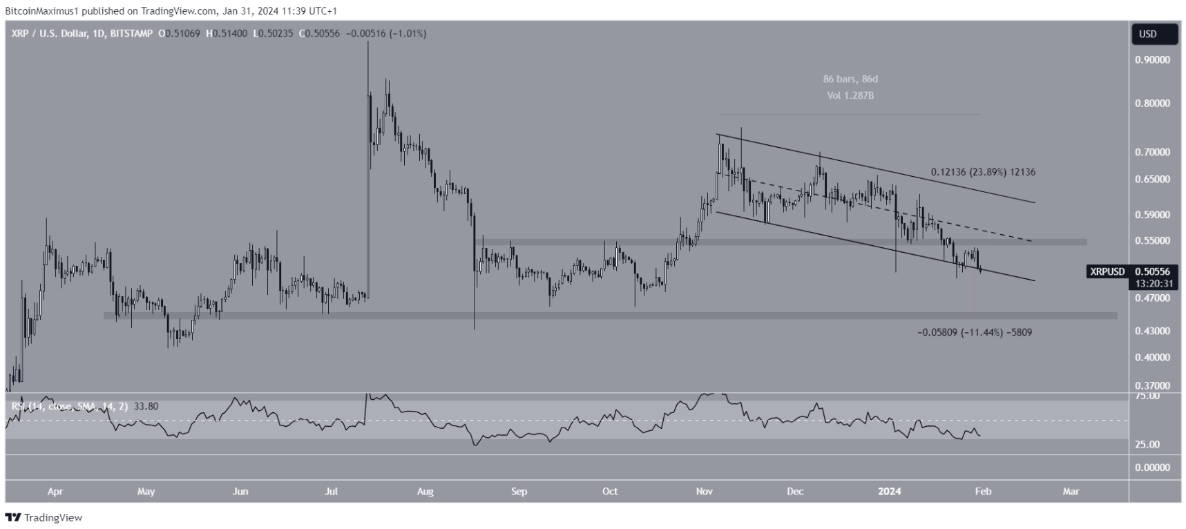 Giá XRP đã giảm kể từ tháng 7 năm 2023, tạo ra một đỉnh thấp hơn vào tháng 11.