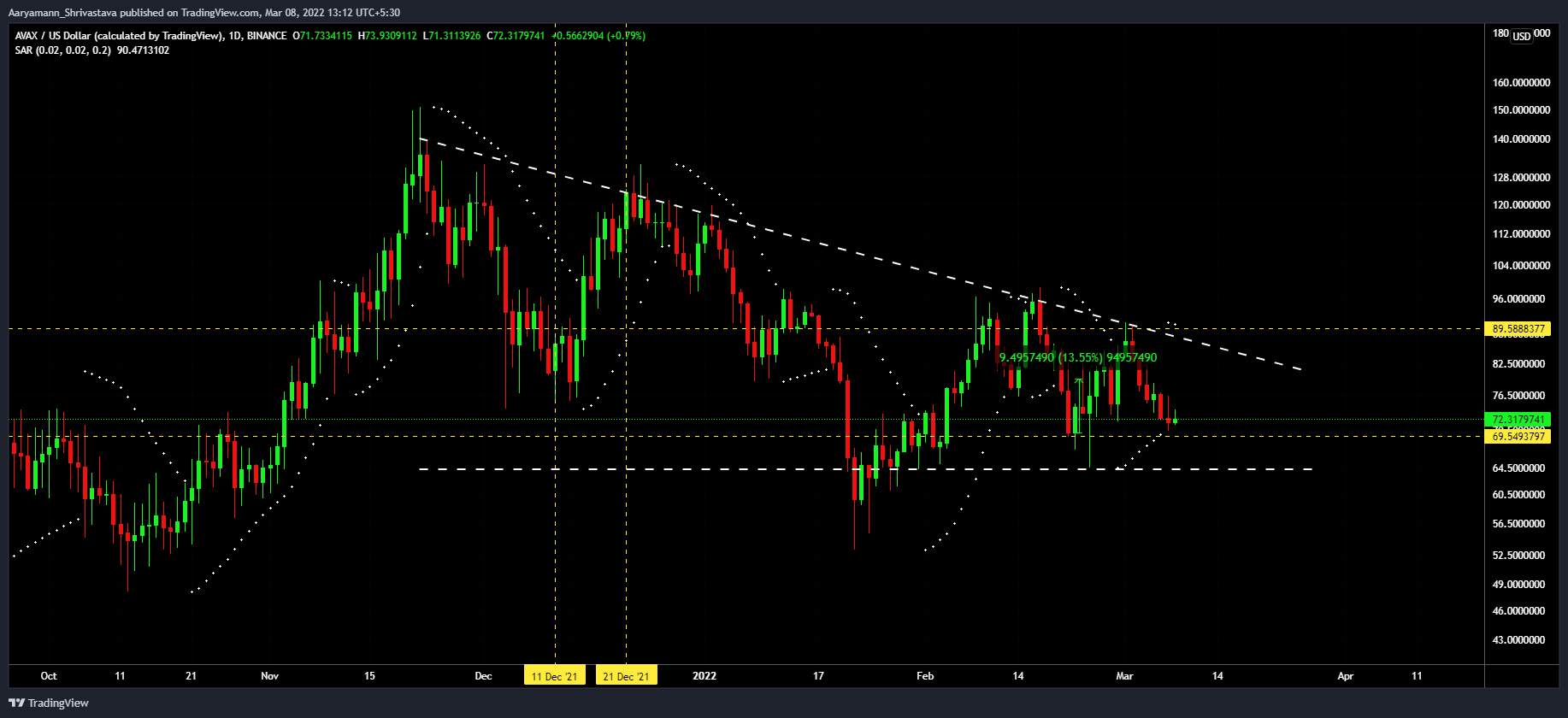 Trong khi mức hỗ trợ quan trọng 69,5 đô la tiếp tục được test, AVAX đang mắc kẹt trong nêm xu hướng giảm trên biểu đồ dài hạn. Điều này có thể kìm hãm AVAX hợp nhất dưới 80 đô la cho đến cuối tháng 3 trừ khi altcoin này có thể vượt ra khỏi nó.