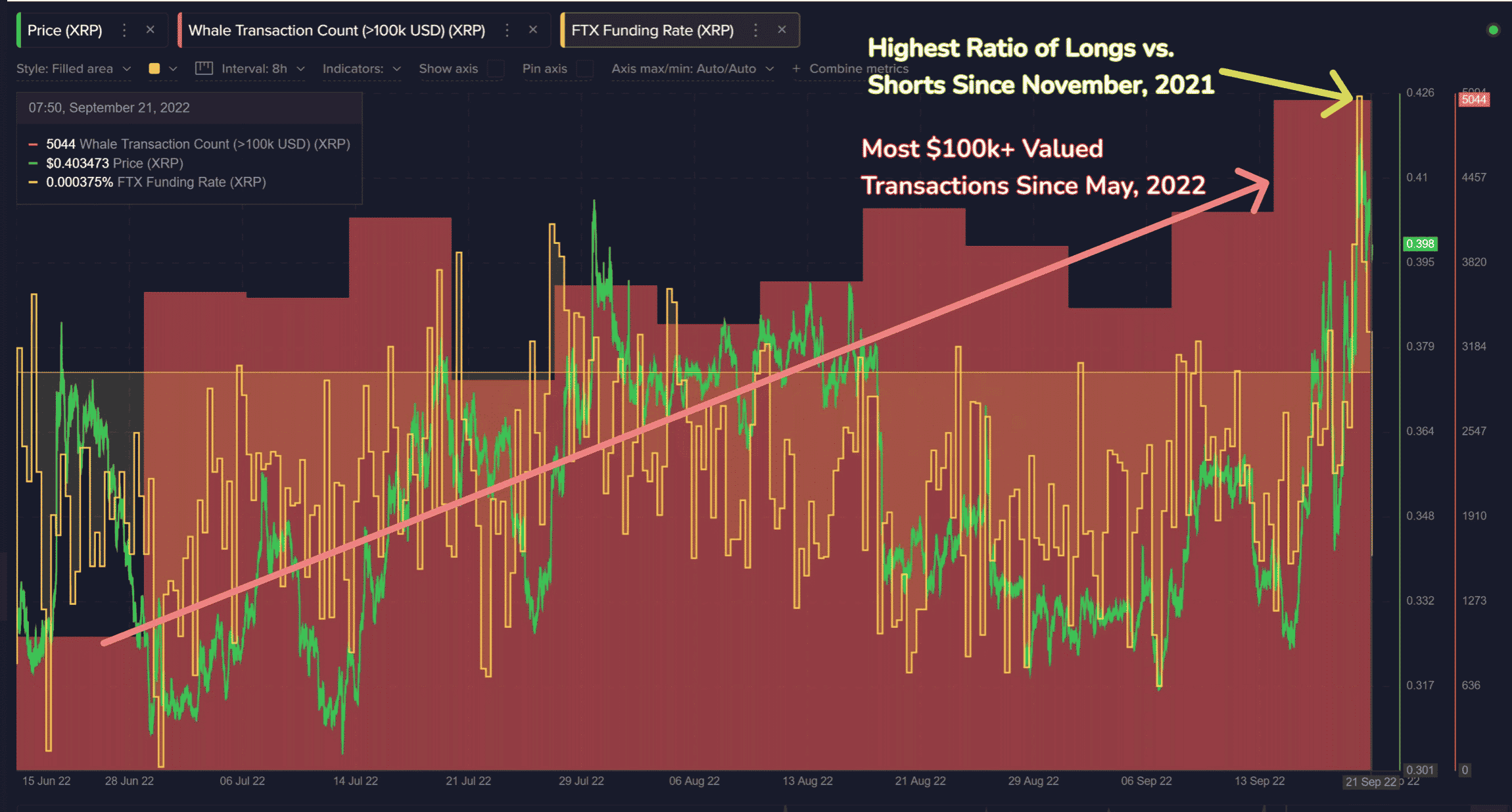 XRP tăng giá lành mạnh từ giữa tháng 9 khi tâm lý chuyển sang ủng hộ phe bò. Theo đó, giá có cơ hội retest mức kháng cự của tháng 5/2022. Nhưng đáng tiếc là cá voi đã bắt đầu kích hoạt áp lực bán trong ngắn hạn.