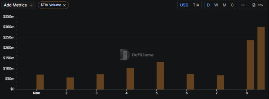 Khối lượng giao dịch tổng thể của Celestia bùng nổ, tăng vọt gấp 4,4 lần chỉ trong một ngày, kéo theo đà tăng mạnh của giá. Theo dữ liệu từ DefiLlama, con số này đã nhảy từ 67,94 triệu USD lên 301,7 triệu USD.