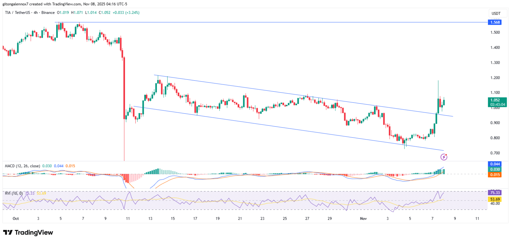 Trên biểu đồ 4 giờ, TIA đã phá vỡ kênh giảm giá, đánh dấu một bước tiến quan trọng sau giai đoạn điều chỉnh. Altcoin hiện đang tạm dừng quanh mức đỉnh mới, có khả năng là đợt retest sau cú bứt phá gần đây.