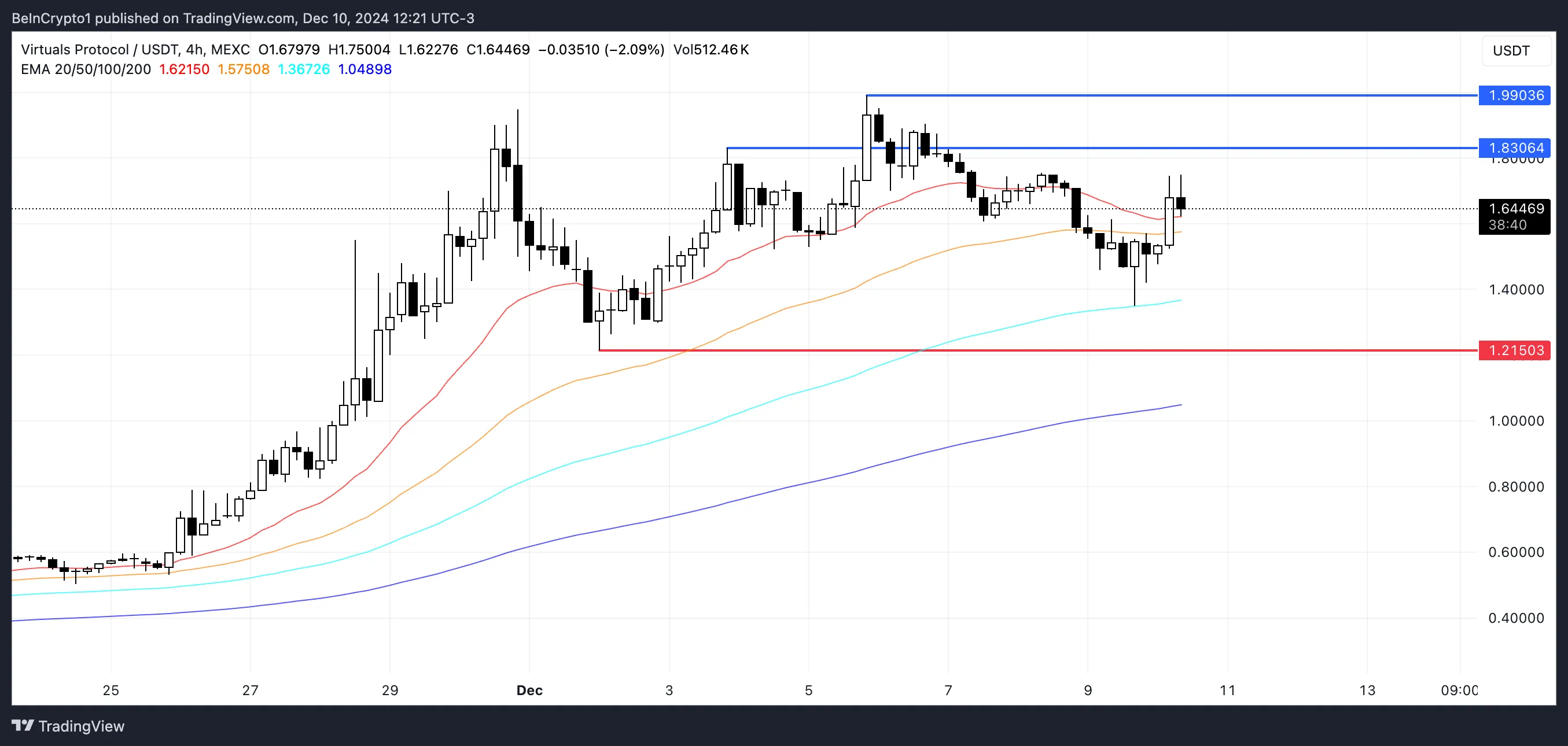 Nếu đà tăng phục hồi, VIRTUAL có thể kiểm tra mức kháng cự tại 1,83 USD. Nếu vượt qua mức này, giá có thể tiếp tục tăng lên kiểm tra mức cao nhất mọi thời đại là 1,99 USD, đạt được vào ngày 5 tháng 12, khi các AI Agent tiếp tục thu hút sự chú ý. Quan trọng hơn, mặc dù VIRTUAL đang tăng giá hôm nay, nhưng các đồng tiền AI lớn khác, như RENDER và TAO, đang giảm lần lượt 12% và 18%.