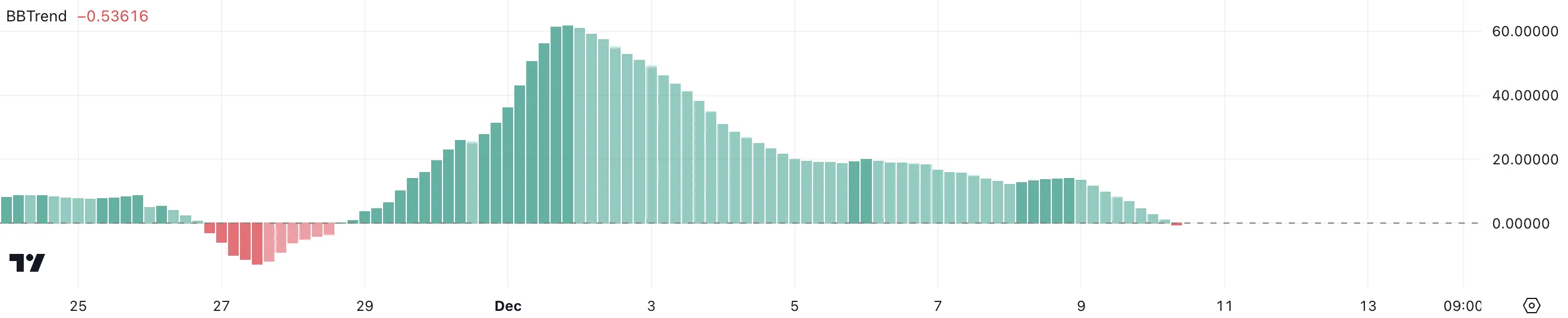 Chỉ báo BBTrend của VIRTUAL đã chuyển sang âm sau khi duy trì mức dương kể từ ngày 29 tháng 11, đạt đỉnh 61 vào ngày 1 tháng 12. Mức hiện tại là -0,53, cho thấy sự thay đổi trong xu hướng và khả năng đà tăng đã suy yếu. BBTrend là chỉ báo sử dụng Bollinger Band để đo lường hướng xu hướng và đánh giá thị trường, với giá trị dương báo hiệu đà tăng và giá trị âm cho thấy khả năng giảm giá.
