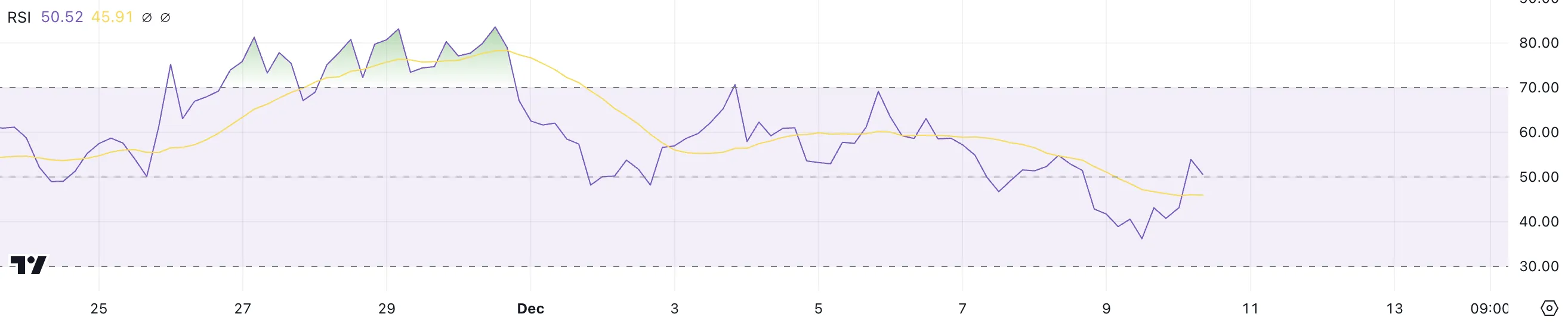 Giá VIRTUAL đã tăng mạnh, ghi nhận mức tăng 382,5% trong vòng 30 ngày qua, giúp nó trở thành nền tảng hàng đầu trong việc tạo ra các AI Agent. Tuy nhiên, động lực tăng trưởng dường như đang giảm dần khi chỉ số RSI của VIRTUAL hiện ở mức 50, phản ánh tâm lý thị trường trung lập.