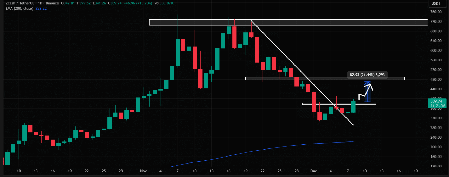 Phân tích khung thời gian ngày cho thấy ZEC đang nỗ lực chinh phục vùng kháng cự quan trọng tại 383 USD, đồng thời thử thách đường xu hướng giảm hình thành từ ngày 20/11. Tuy nhiên, ZEC đã liên tục kiểm tra khu vực này suốt sáu phiên giao dịch gần đây mà vẫn chưa thể đóng cửa ổn định bên trên, cho thấy lực bán vẫn chiếm ưu thế nhất định. Chuỗi thất bại tại vùng cản then chốt này khiến cấu trúc xu hướng chung tiếp tục nghiêng về trạng thái suy yếu.