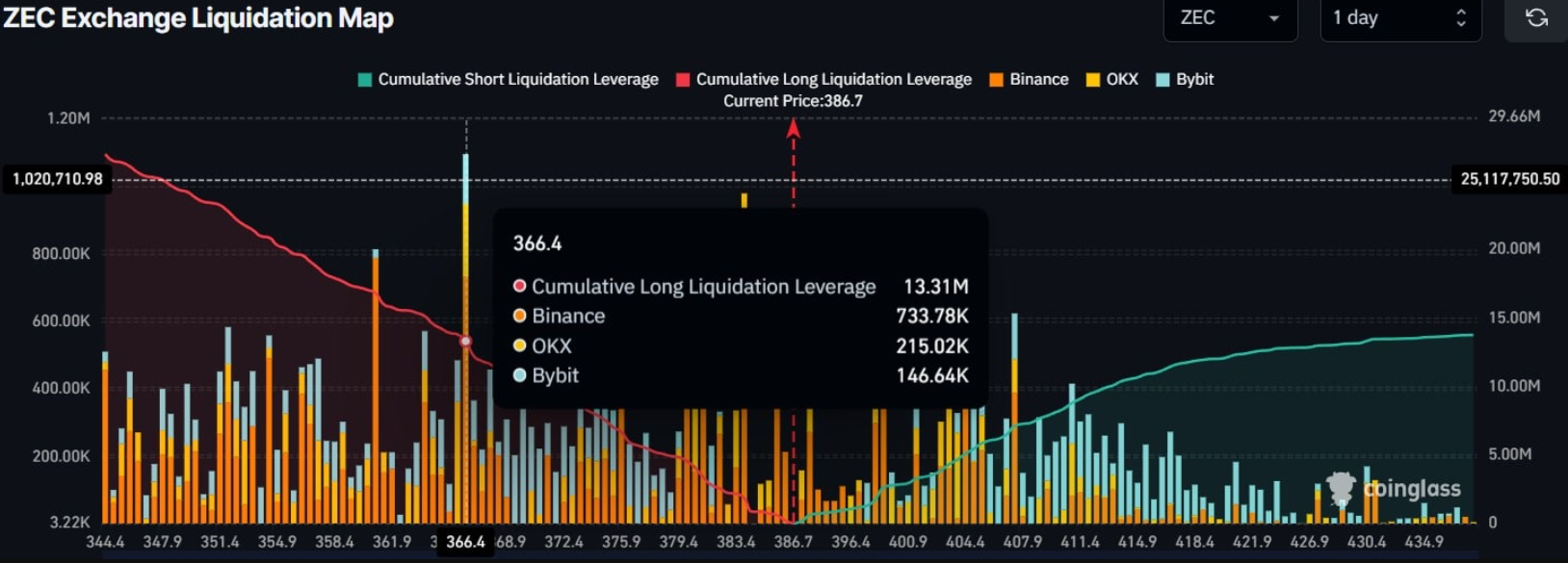 Dữ liệu từ CoinGlass cho thấy các trader hiện đang nắm giữ mạnh các vị thế Long, phản ánh tâm lý lạc quan trên thị trường ZEC. Các vùng thanh lý quan trọng được xác định lần lượt ở 366,4 USD phía dưới và 407,4 USD phía trên, tạo thành các mốc hỗ trợ – kháng cự rõ ràng cho các trader phái sinh trong phiên.