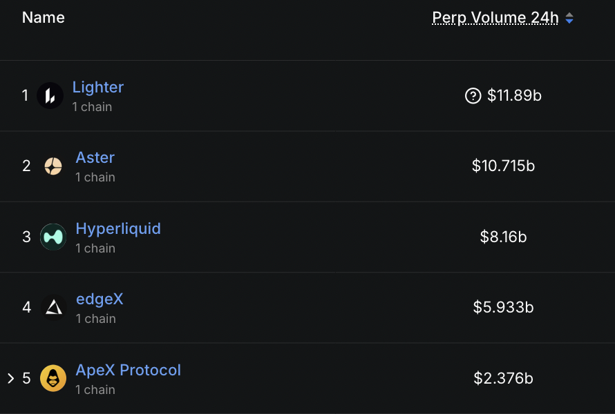 Nền tảng giao dịch phái sinh phi tập trung (perp DEX) Lighter đã vượt lên dẫn đầu bảng xếp hạng với 11,89 tỷ USD khối lượng giao dịch trong 24 giờ qua, theo sau là Aster (10,72 tỷ USD) và Hyperliquid (8,16 tỷ USD).