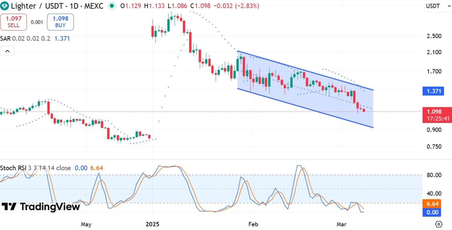 Lighter đang chịu áp lực giảm giá kéo dài sau khi không thể trụ vững trên ngưỡng 1,50 USD. Kể từ đó, altcoin này liên tục di chuyển trong kênh xu hướng giảm, có thời điểm rơi xuống mức 1,07 USD.