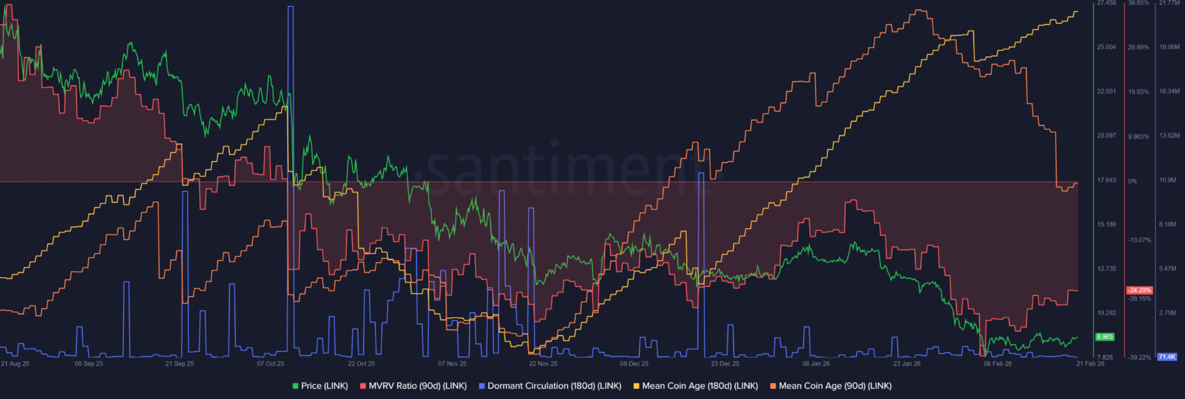 Dữ liệu on-chain từ Santiment cho thấy các holder LINK nắm giữ trong khoảng 3 tháng đang phải chịu áp lực thua lỗ đáng kể. Cụ thể, chỉ số MVRV 90 ngày ở mức 24,29% cho thấy mức giá mua trung bình của nhóm nhà đầu tư này đang thấp hơn khoảng 24% so với hiện tại.