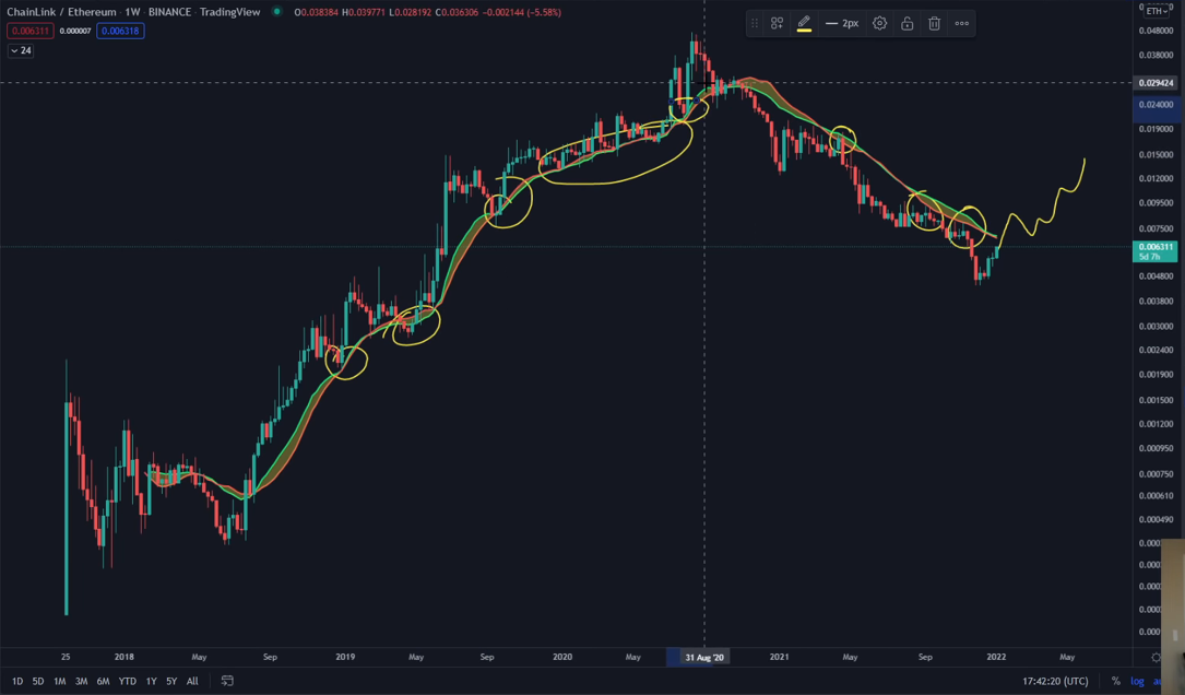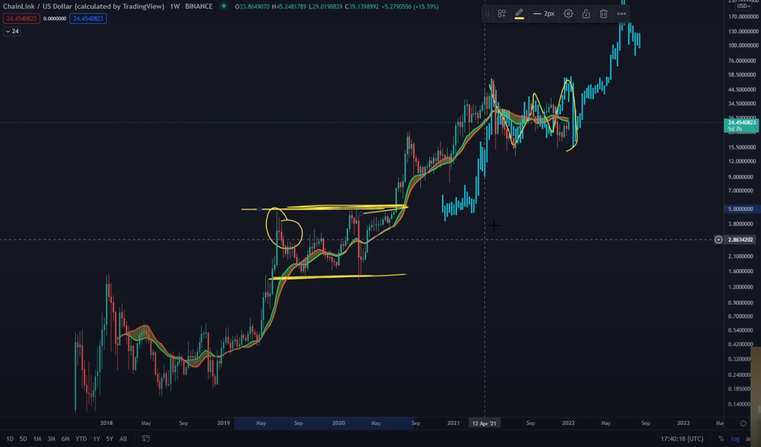 Cowen nói rằng các trader nên chú ý xem LINK ở trên hay dưới “dải hỗ trợ của thị trường tăng giá”, một chỉ báo kỹ thuật kết hợp giữa đường trung bình động đơn giản SMA 20 tuần và đường trung bình động hàm mũ EMA 21 tuần.