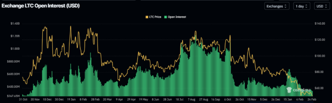 Dữ liệu từ thị trường hợp đồng tương lai của Litecoin cho thấy OI đã lùi về 328,60 triệu USD vào thứ Ba, kéo dài xu hướng suy giảm bắt đầu từ giữa tháng 1. Đà đi xuống liên tục của OI phản ánh sự thu hẹp trong mức độ tham gia của nhà đầu tư, đồng thời phát đi tín hiệu kém tích cực về triển vọng ngắn hạn của thị trường.
