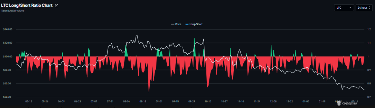 Bên cạnh đó, tỷ lệ long/short của Litecoin chỉ đạt 0,94 trong cùng ngày và đã lần thứ ba trong tháng không thể trụ vững trên ngưỡng 1. Điều này cho thấy các trader tỏ ra dè dặt với việc mở thêm vị thế mua. Việc tỷ lệ long/short nằm dưới 1 càng nhấn mạnh tâm lý bi quan đang chiếm ưu thế, khi phần đông thị trường nghiêng về kịch bản giá Litecoin tiếp tục suy giảm.