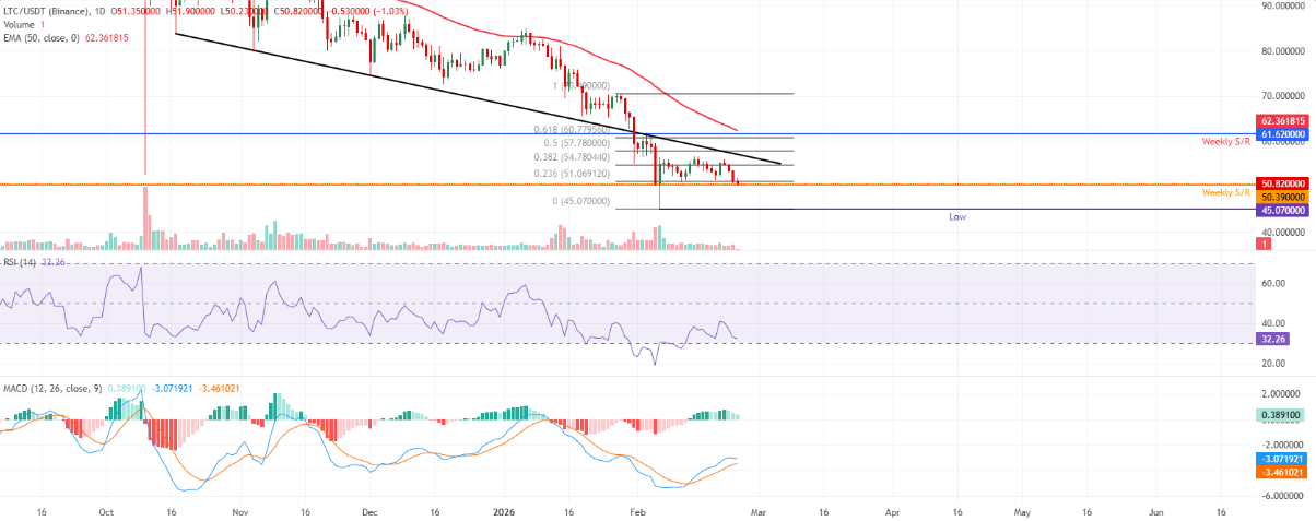 Tại thời điểm ghi nhận vào ngày thứ Tư, giá Litecoin đang dao động quanh mốc 50,39 USD. Đường trung bình động hàm mũ (EMA) 50 ngày tiếp tục dốc xuống và hiện nằm tại 62,36 USD, củng cố bức tranh xu hướng giảm khi giá vẫn bị kìm hãm bên dưới ngưỡng này. Mỗi nỗ lực hồi phục đều nhanh chóng suy yếu khi tiếp cận EMA 50 ngày, cho thấy phe bò vẫn chưa đủ lực để tạo ra một cú đảo chiều đáng tin cậy.