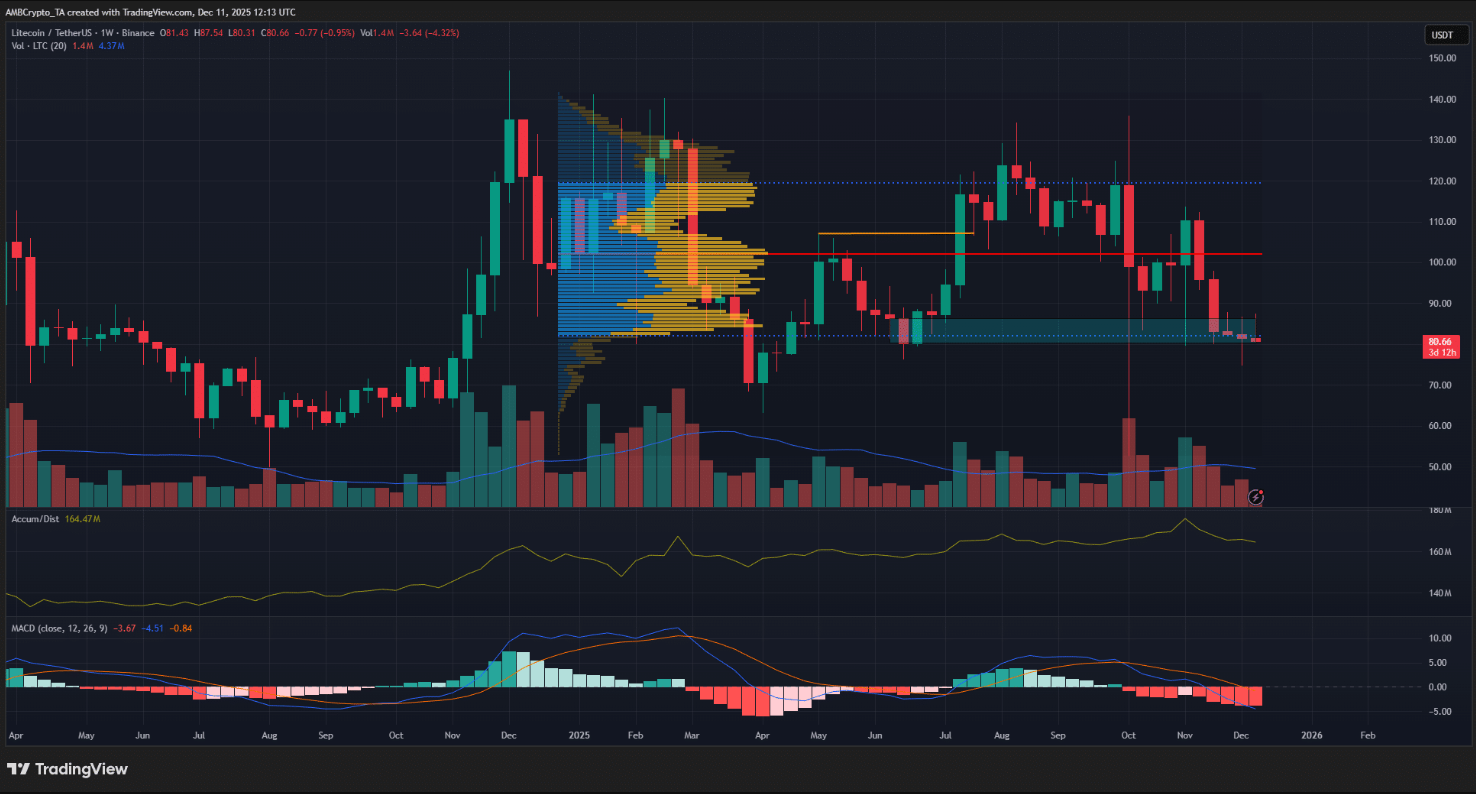 Trên khung tuần, Litecoin đang neo mình quanh vùng hỗ trợ quan trọng $82, nơi từng khởi động đợt tăng mạnh vào tháng 6 trước khi cấu trúc tăng tuần bị phá vỡ. Đáng chú ý, đây cũng là mức giá thấp nhất trong vùng giá trị (VAL) cho năm 2025, một tín hiệu hấp dẫn cho những nhà đầu tư tìm kiếm cơ hội.