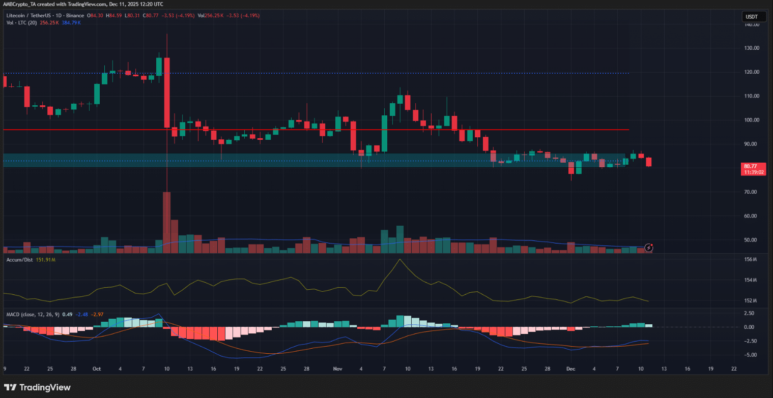 Phát hiện này được củng cố bởi công cụ Fixed Range Volume Profile, trong khi chỉ báo Accumulation/Distribution (A/D) vẫn duy trì đà tăng, gợi ý rằng Litecoin có khả năng chống chọi áp lực bán gần đây. Tuy nhiên, MACD lại cảnh báo động lực giảm đang gia tăng, tạo nên bức tranh thị trường phân hóa.