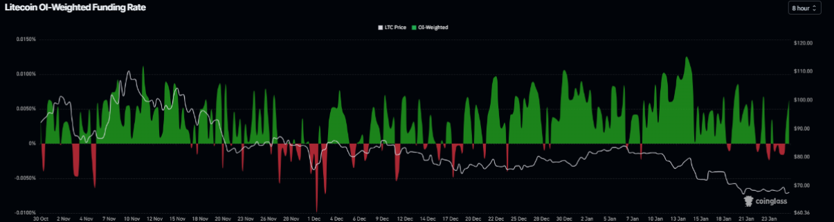 Dữ liệu OI-Weighted Funding Rate từ CoinGlass cũng củng cố triển vọng này: số trader đặt cược giá giảm tiếp tục thấp hơn các vị thế dự đoán tăng. Chỉ số này đã chuyển sang mức tích cực từ Chủ nhật và hiện đứng ở 0,0063%, cho thấy các vị thế Long đang phải trả phí cho Short. Theo kinh nghiệm thị trường, khi funding rate chuyển từ âm sang dương, Litecoin thường ghi nhận những dấu hiệu hồi phục rõ rệt.