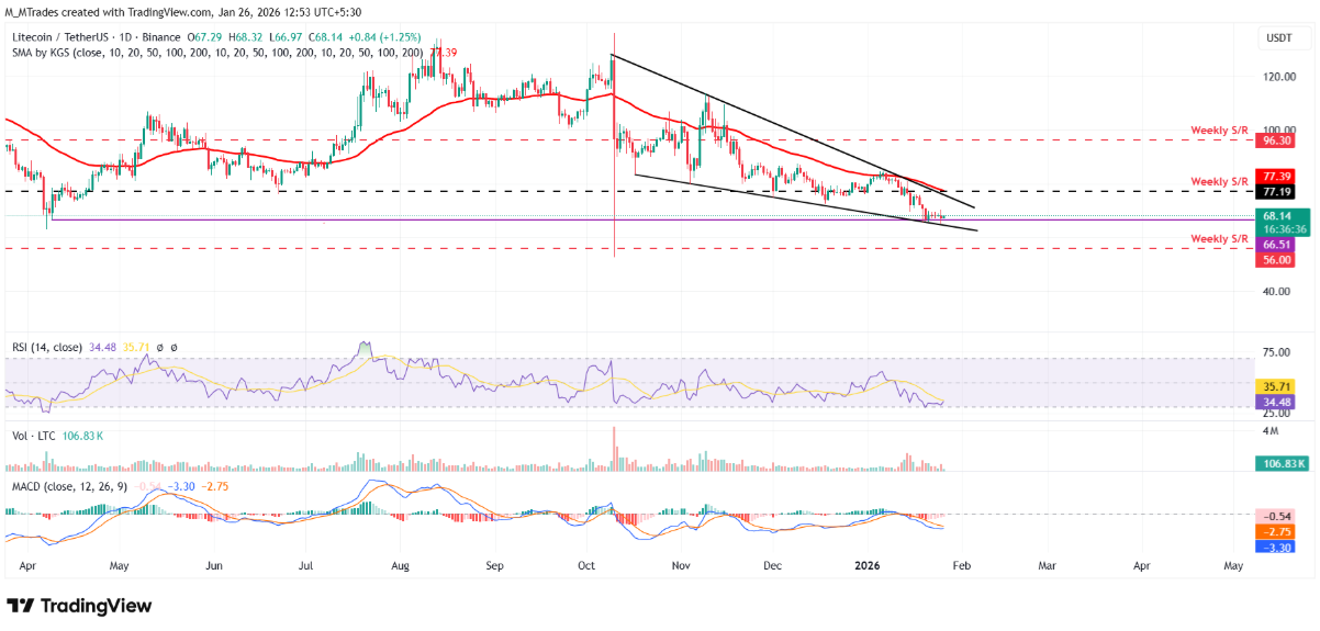 Giá Litecoin (LTC) đang ghi nhận đà hồi phục nhẹ, hiện giao dịch trên mốc 68 USD vào thời điểm sáng thứ Ba. Sau khi chạm vùng hỗ trợ quanh đáy của mô hình cái nêm giảm, LTC dường như tìm thấy lực cản vững chắc. Các tín hiệu on-chain cùng dữ liệu phái sinh cải thiện cho thấy đồng coin này có triển vọng bật tăng trở lại, nếu người mua tiếp tục bảo vệ thành công khu vực hỗ trợ then chốt.