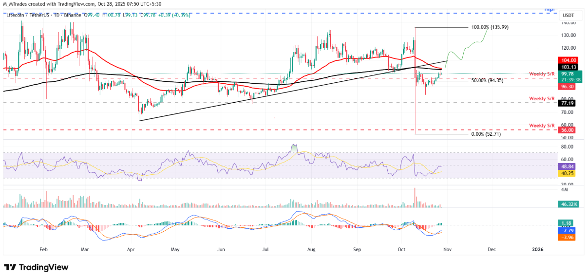 Giá Litecoin đã bứt phá qua ngưỡng kháng cự tuần tại 96,30 USD vào thứ Bảy, trước khi tiếp tục tăng thêm 3,15% trong phiên kế tiếp. Tuy nhiên, lực mua suy yếu khi LTC chạm đường EMA 200 ngày tại 103,13 USD trong phiên thứ Hai, khiến giá tạm thời bị từ chối. Đến tối thứ Ba, LTC đang dao động quanh mốc 99,78 USD, ghi nhận trạng thái giằng co của thị trường.